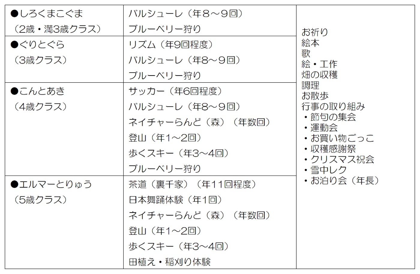 絵本やお歌を楽しみ、絵や工作、畑や調理、お散歩、講師の先生によるバルシューレ、運動会やおかいものごっこ、クリスマスには歌や踊り、劇などを楽しみます。