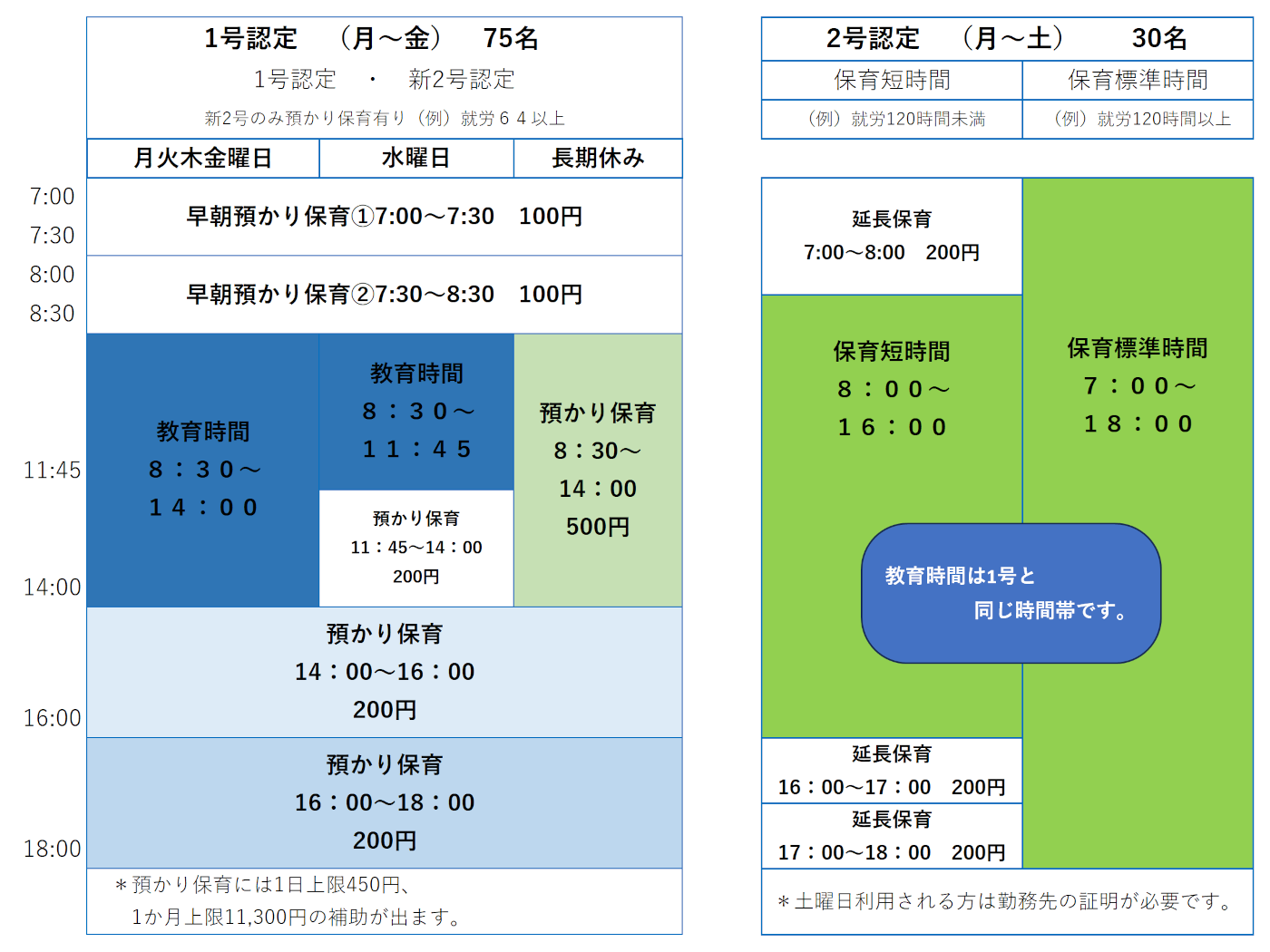 | 預かり保育料 | 1号、2号によって変わります。 |